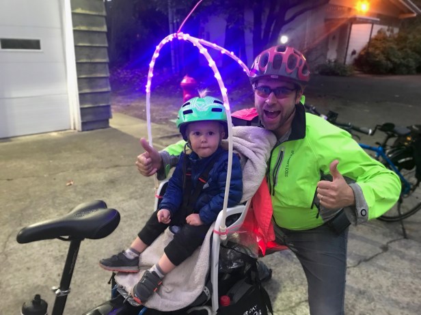 Being a car-free cycling family in the Seattle area, rain gear is a MUST. Some older kids probably do great with simply a big hat, poncho, and that PNW resilience; but for my little guy (now 2.5) the full bubble cover was the best low-hassle choice for his wee self.