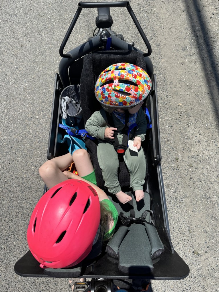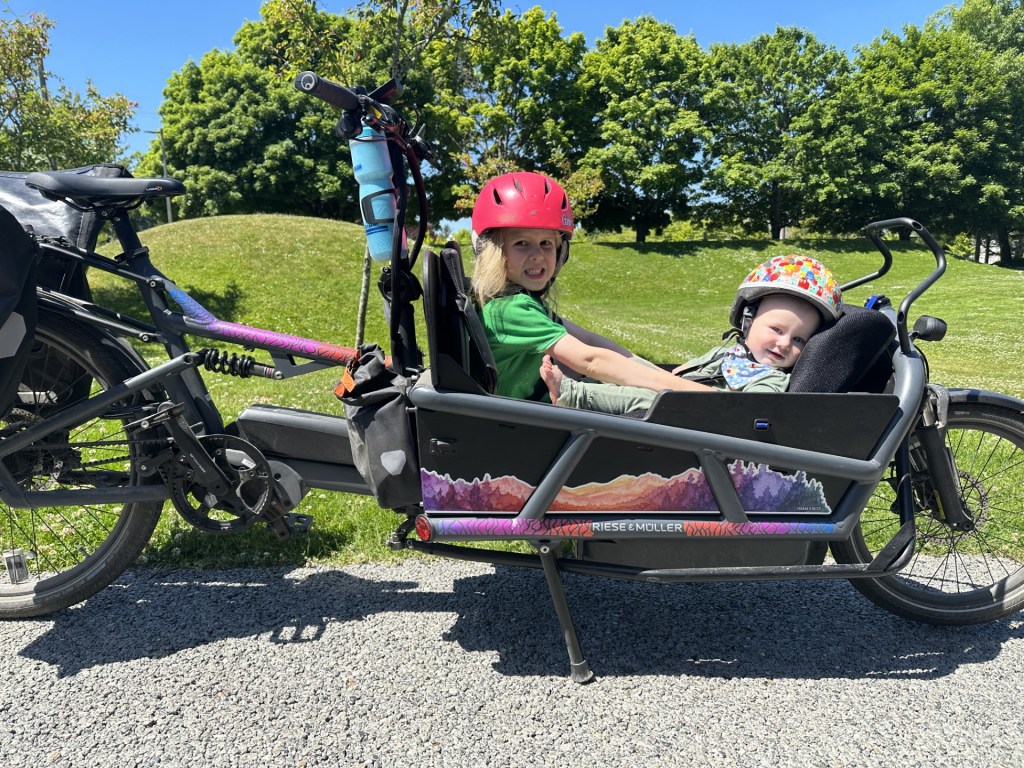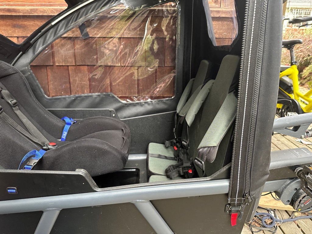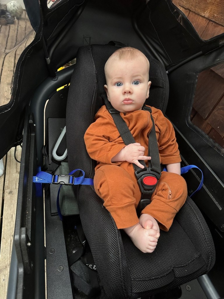 In 2022 we decided to upgrade our beloved bakfiets bike to a slightly bigger one – selling our Riese and Müller Load 60 and ordering the Load 75. We absolutely love both of these bikes! This post details our use of the Melia seat in a custom way that was super comfy for both our kiddos in the box (big brother is 5 years old). At first we put our new baby in a carseat strapped inside on the table. This provided maximum support for his body before he learned to hold up his head and sit – but it was really cramped.