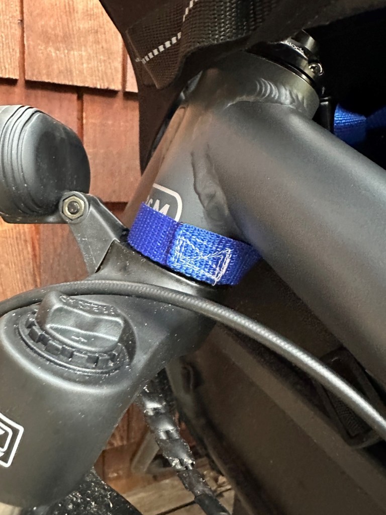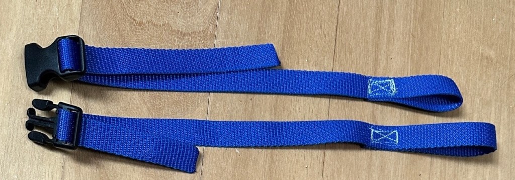 Create 3 total sets of straps like the set pictured below. On one end you have a loop, secured with sewing machine. On the other end melt the end to prevent fraying and thread through your buckle piece. From each set, one buckle side goes onto the bike and the other attaches to the Melia seat. When the seat is not in use, I leave all the straps looped into the bike for a very quick seat insert next time I need it.