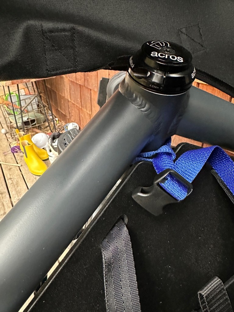 Recently we slide the Melia seat as close as possible to the right side of the bike to accommodate my tall 5-year-old’s knees (see below). If you have three total kiddos you may want to experiment with the buckle coming out through the bottom of the Melia Seat and/or from the outside top of the walls so you can raise it higher from the ground a bit more. For short rides the seat resting on kid legs is also tolerable – but it really depends on the kids!